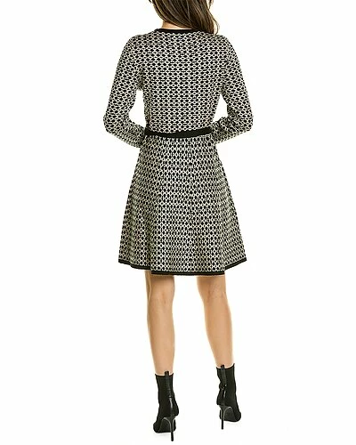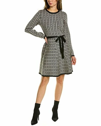 - A-Line Sweaterdress in black multicolor with herringbone knit design and self-tie sash at waist