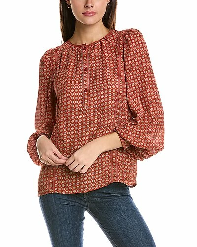 - Blouse in terracotta hexagon with blouson sleeves and button cuffs