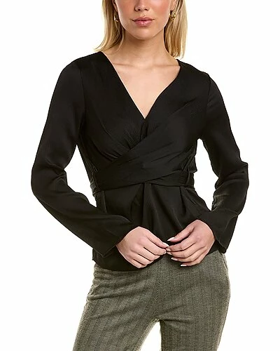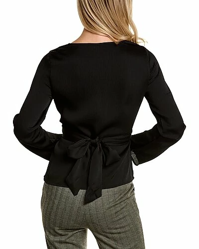 - Crossbody Blouse in black with crossover bust and self-tie sash at waist