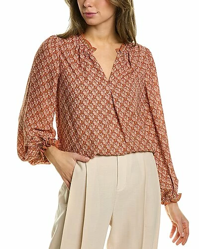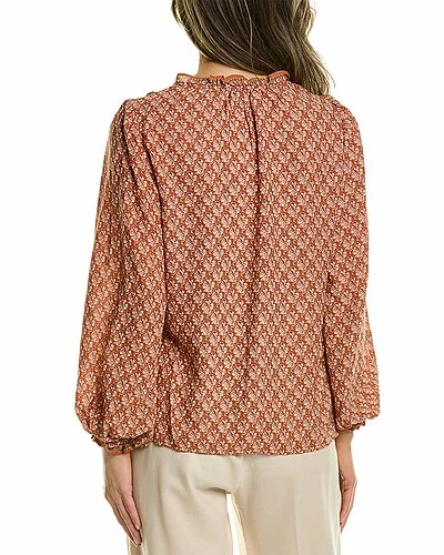 - Floral Crepe Blouse in purple with split neck, elasticized cuff, and ruffle accents