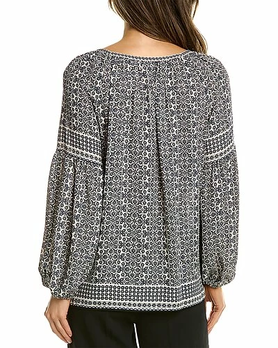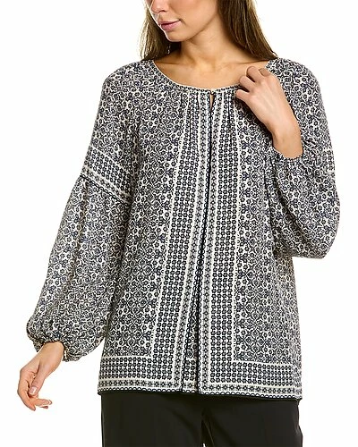 - Inverted Pleat Blouse in ivory and blue combo with dropped shoulder sleeves and elasticized cuffs