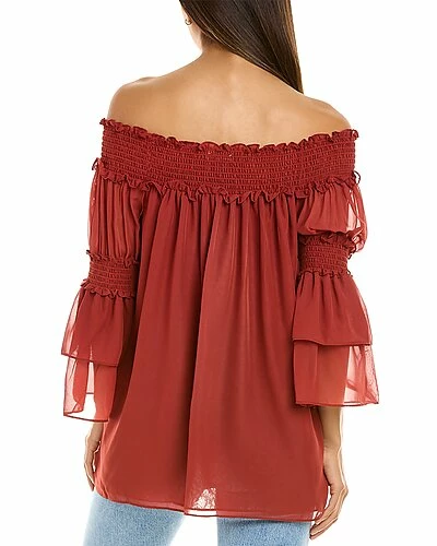 - Off-the-Shoulder Top in red adobe with smocked off-the-shoulder neckline, smocked bell sleeves, and tiered cuffs