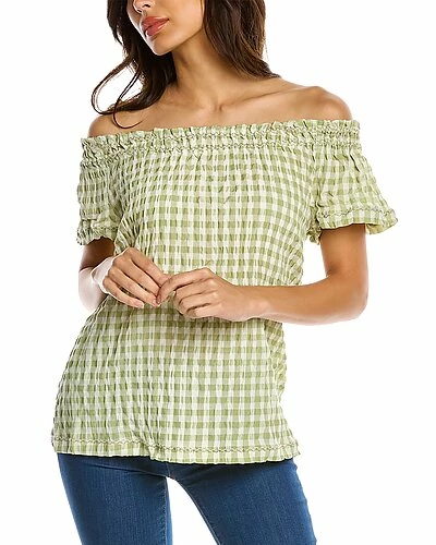 - Off-The-Shoulder Top in green and ivory with puckered design