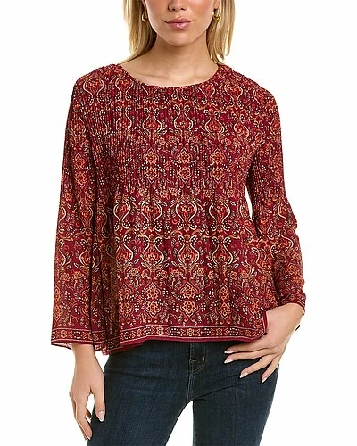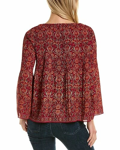 - Pleated Blouse in wine leafy paisley with bell sleeves