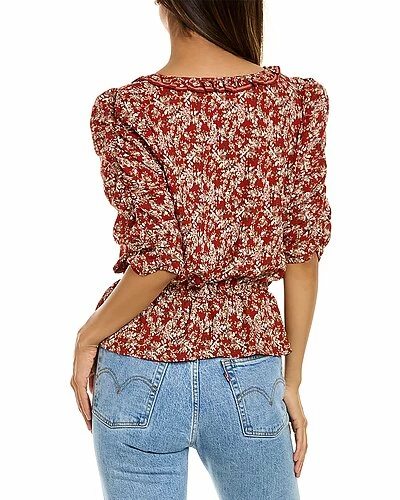 - Ruched Elbow Sleeve Top in red adobe tossed carnation mix with ruffle trim and elasticized peplum hem