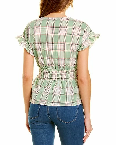 - Ruffle Tie-Front Blouse in green with V-neck, embroidered trim, ruffled cuffs, pleated waist, and self-tie sash at waist