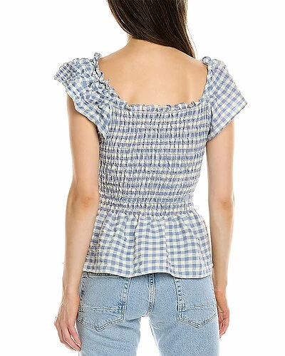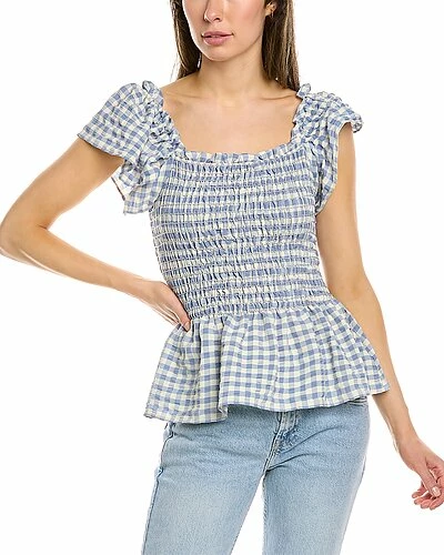 - Smocked Blouse in blue and ivory with ruffle trim, elasticized neckline, and peplum hem
