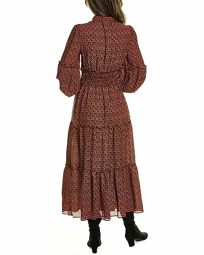 - Smocked Midi Dress in brick and woodrose combo with surplice front, smocked cuffs, balloon sleeves, and tiered skirt