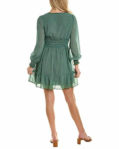 - Smocked Mini Dress in green & gold retro dot geo with shirred shoulders, sheer blouson sleeves, smocked waist and cuffs, and shirred hem