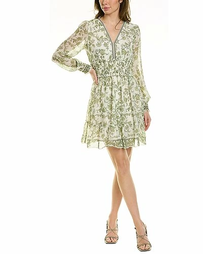 - Smocked Mini Dress in cream & sage rose toile with shirred shoulders, sheer blouson sleeves, smocked waist and cuffs, and shirred hem
