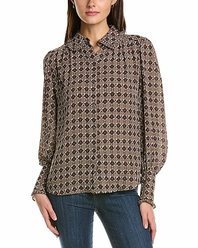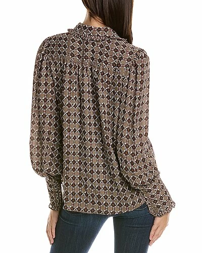 - Smocked Top in stone woven lattice geo with spread collar, ruffle trim, blouson sleeves, and button cuffs