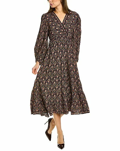 - Surplice Midi Dress in navy and rust floral with elasticized waist, plunging V-neck, and ruffle hem