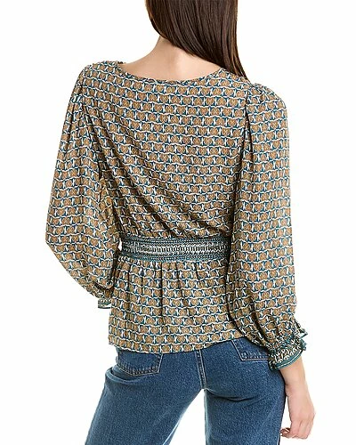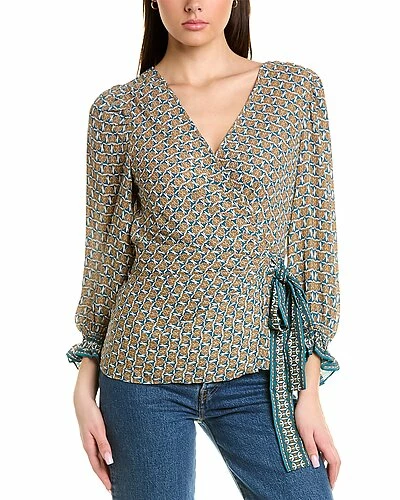 - Waist Tie Blouse in teal small nouveau dot with wrap style, puffed 3/4-length sleeves, and elasticized poet cuffs