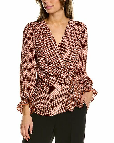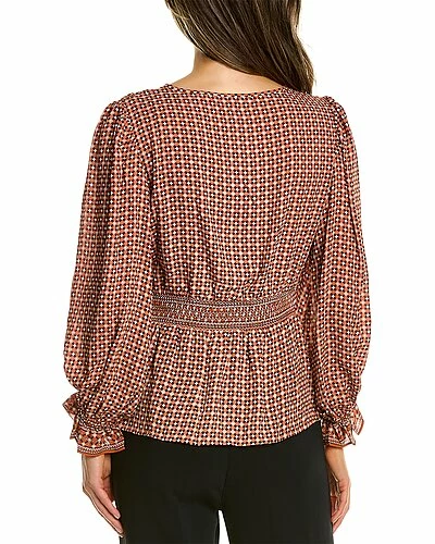 - Waist Tie Blouse in terra geo checkers with wrap style, puffed 3/4-length sleeves, and elasticized poet cuffs
