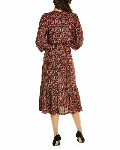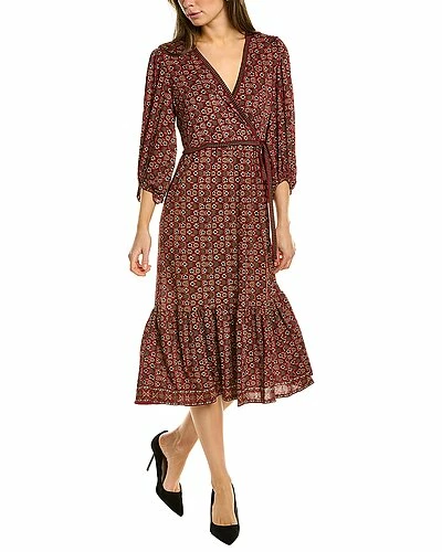 - Wrap Midi Dress in berry pop daisy lattice with surplice neck, 3/4-length sleeves, elasticized cuffs, shirred hem, and self-tie left waist