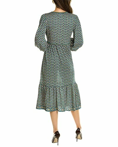 - Wrap Midi Dress in teal graphic shadow leaf with surplice neck, 3/4-length sleeves, elasticized cuffs, shirred hem, and self-tie left waist